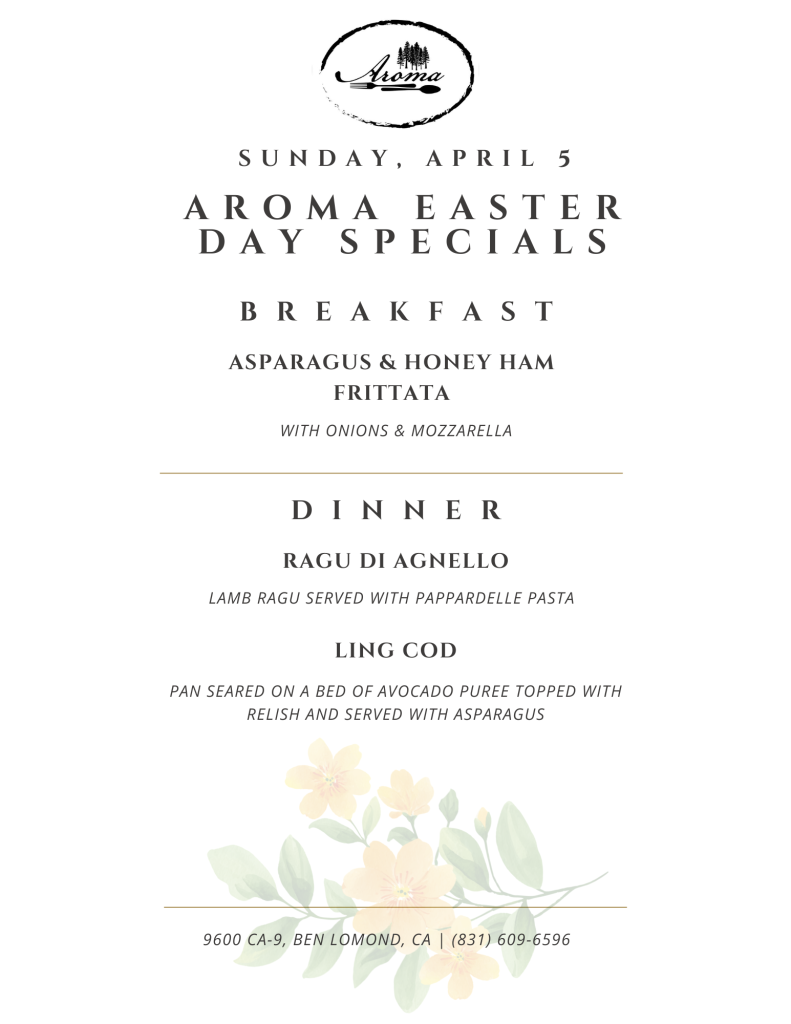 Email us at AromaRestaurant831@gmail.com to tell us about your needs, and we’ll do our best to accommodate you!
